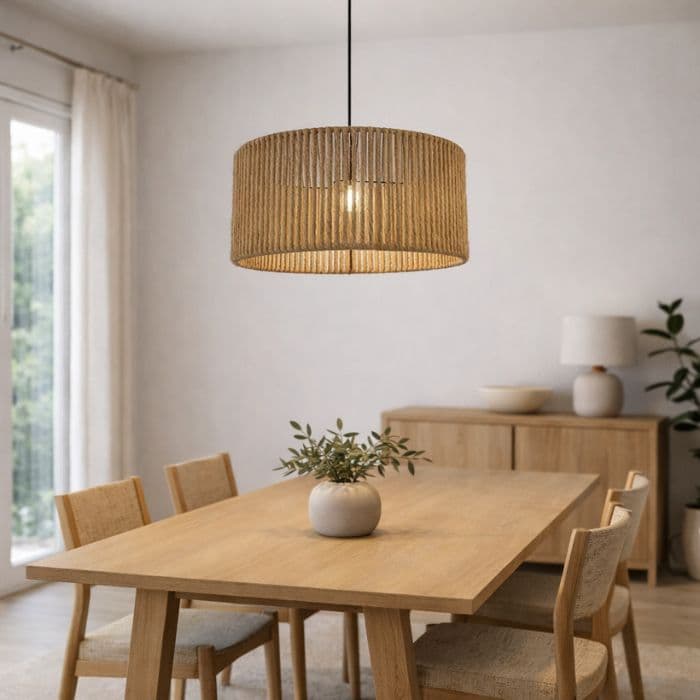 Un clásico reinventado. El modelo Kenia en yute combina la rusticidad de la fibra natural con toques modernos gracias a sus accesorios en color negro. Viene lista para instalar y es ideal para jugar con las alturas o colocar varias en línea sobre una barra o isla de cocina.