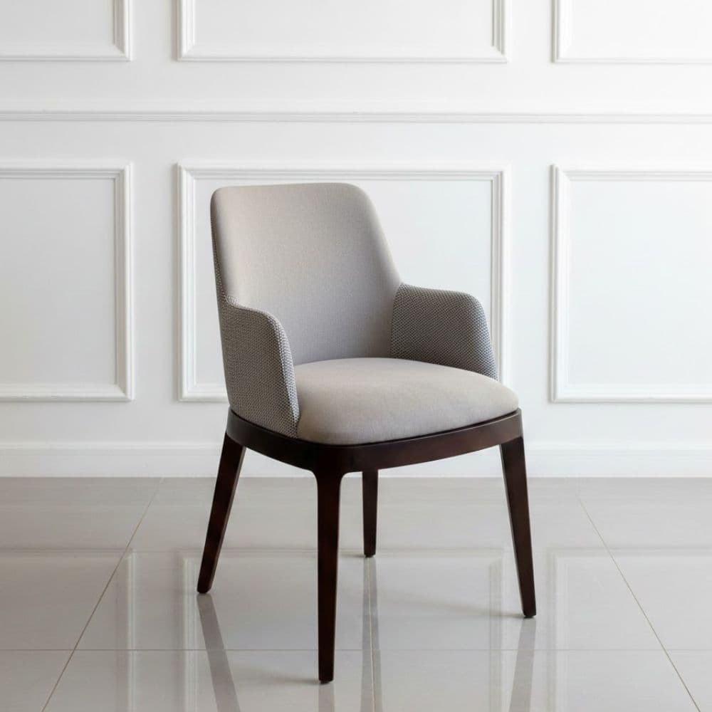 El sillón Emily con apoyabrazos eleva la experiencia de sentarse a la mesa. Con la misma estructura en madera maciza y tapizado en pana antimanchas, ofrece mayor confort gracias a sus apoyabrazos envolventes y diseño ergonómico. Ideal para colocar en cabeceras de mesa o en espacios donde el confort y el diseño son protagonistas.